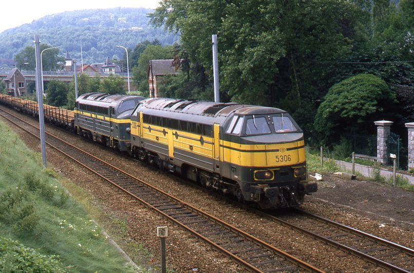 Deze fotogroep bevat twee dia's. Twee diesellocomotieven reeks 53 (type 203) slepen samen een goederentrein bestaande uit platte wagens met rongen. Op het moment van de opname waren de elektrificatiewerken volop bezig, de eerste bovenleidingmasten staan al langs het spoor. Schenking van Myriam Hendrickx.