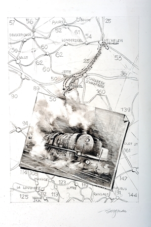 Zwart-witafbeelding van een Belgische netwerkkaart met enkele plaatsnamen. In een apart kader bovenop de kaart heeft de tekenaar stoomlocomotief 1005 getekend. Het traject van de zogenaamde 'spooktrein' wordt met een stippellijn aangeduid (Brussel - Schaarbeek - Mechelen - Schaarbeek - Brusse). De 'spooktrein' was een konvooi van politieke gevangenen dat op 2 september 1944 van Brussel-Zuid naar Duitse concentratiekampen moesten worden overgebracht. Enkele spoorweglieden slaagden er in de trein zolang op te houden in station Brussel-Zuid en zo vaak om te doen rijden via Vorst-Zuid en Muizen, dat de Duitsers de trein uiteindelijk in het station Brussel-Klein Eiland achterlieten om te vluchten voor de geallieerden.
