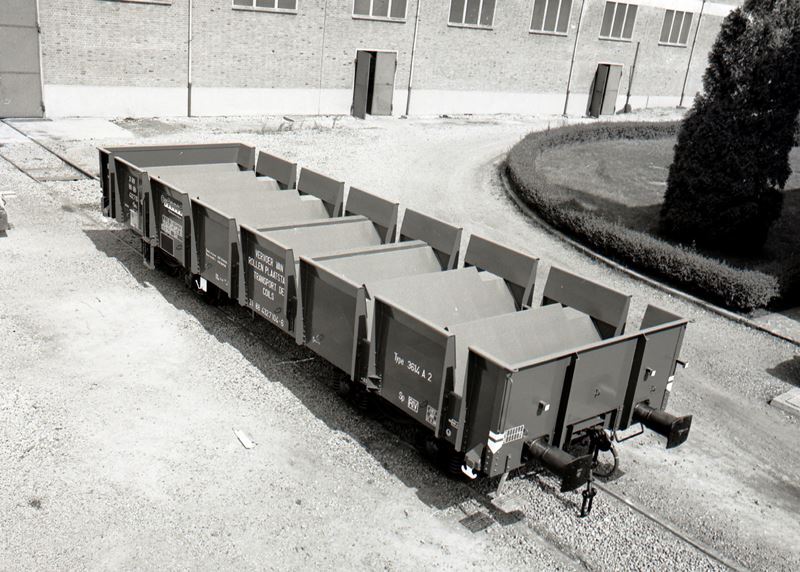 Ce groupe de photos contient cinq négatifs. Ils montrent un wagon plat sur bogies pour le transport de bobines de tôle d'acier. Le wagon vient d'être construit et se trouve dans la cour de l'usine. Il porte la désignation 3614A2.