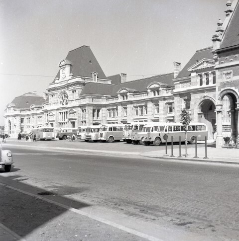 De foto toont het station aan de straatzijde. Het wordt aan beide zijden geflankeerd door een gebouw bestaande uit drie bouwlagen onder een mansardedak. De monumentale toegangspoorten hebben bovenaan een rondboog. De centrale inkomhal wordt bekroond door de stationsklok met een gebogen fronton en een spits tentdak. Voor het gebouw staan vervangingsbussen van de NMBS in groen beige livrei geparkeerd.