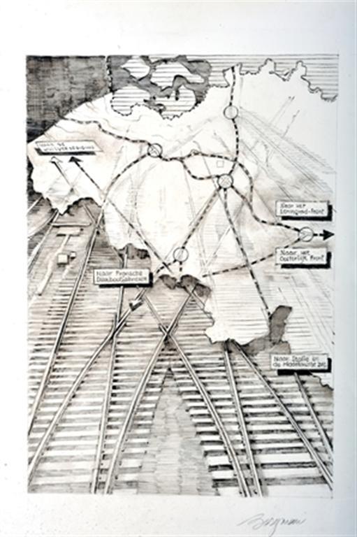 Zwart-witafbeelding van een kaart van België met enkele belangrijke spoorwegen en knooppunten. Deze waren van cruciaal belang tijdens de Tweede Wereldoorlog, zowel voor Duitsland als voor de geallieerden. De opschriften op de kaart bevestigen dit: 'Naar de kustverdediging', 'Naar Fransche duikbootfabrieken', 'Naar Italië en de Middellandsche zee', 'Naar het Oostelijk Front' en 'Naar het Leningrad-front'. De achtergrond bestaat uit verschillende sporen.