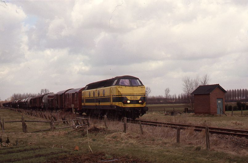 BeschrijvingDeze fotogroep bevat twee dia's. Diesellocomotief 6506 sleept een gemengde goederentrein door de velden.