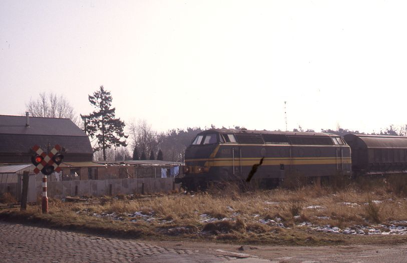 BeschrijvingDiesellocomotief 6503 sleept een goederentrein met gesloten wagens voorbij een bewaakte overweg in Hechtel.