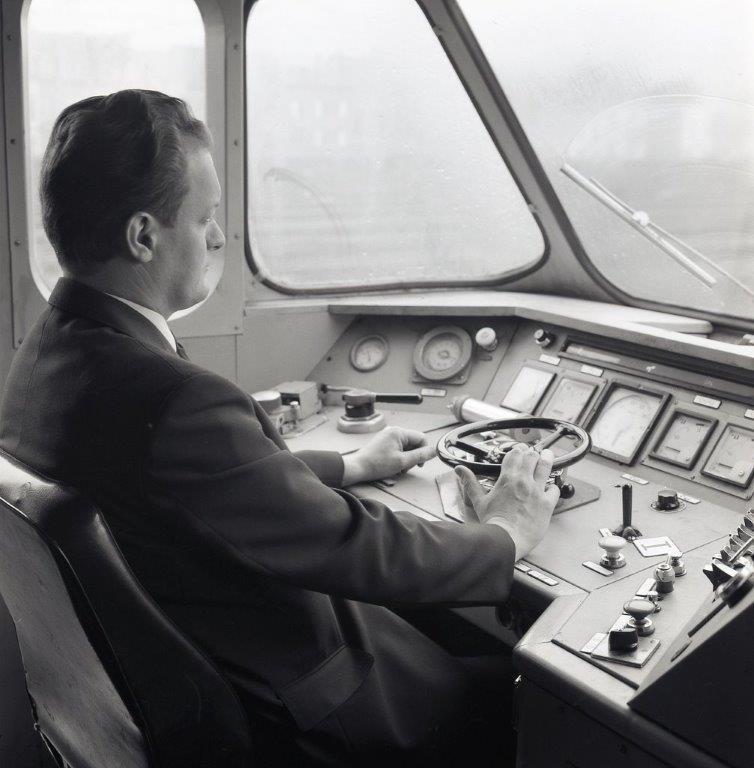 De fotogroep bevat drie negatieven. Ze tonen een treinbestuurder in de stuurpost van een elektrische locomotief van de reeks 20. De bedieningslessenaar is uitgerust met drukknoppen, een rijrichtingskruk, de bolhendel om de trekkracht te regelen en een stuurwiel om de snelheid te bepalen. Met behulp van een snelheidsmeter, volt-, ampère- en manometers controleert de machinist de werking van de locomotief. Links zien we de hendels voor de rechtstreekse en automatische rem.