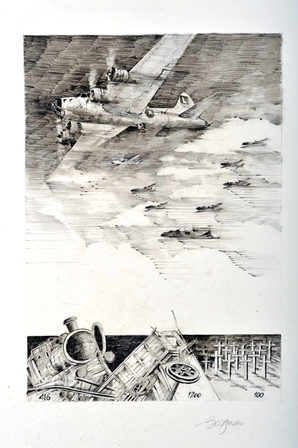 Zwart-witafbeelding van enkele gevechtsvliegtuigen tijdens de Tweede Wereldoorlog. Onderaan zien we een vernielde stoomlocomotief en het getal '416', verwoeste goederenwagens en het getal '1200' en een kerkhof met witte kruisjes met daaronder het getal '100'.