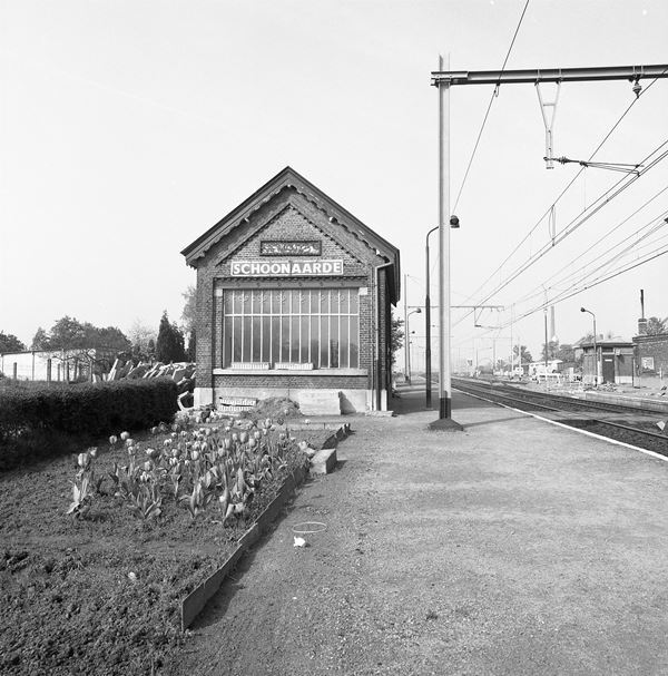 Op de foto zien we een schuilhuisje op het perron van het station Schoonaarde. Op de zijgevel van het schuilhuisje is de stationsnaam aangebracht. Bemerkt het traliewerk voor de grote raam in de zijgevel. Naast het schuilhuisje is een bloemenperk aangelegd. De spoorlijn is geëlektrificeerd.