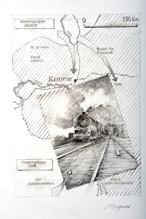 De Slag om Koersk of Operatie Citadel was de grootste tankslag in de geschiedenis en een beslissende slag aan het oostfront in de Tweede Wereldoorlog. Op de tekening zien we een kaart met de plaatsingen en bewegingen van de fronten en legergroepen. In een apart kader werd een stoomlocomotief getekend, die een trein doorheen een tunnel sleept.