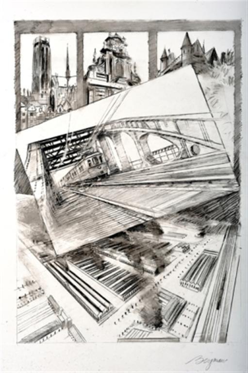 Zwart-witafbeelding van een motorrijtuig dat over een spoorwegbrug rijdt. Op het achterplan staan bovenaan enkele stadszichten: de Sint-Romboutstoren in Mechelen, de Sint-Michielskerk in Leuven en het Gravensteen in Gent. Onderaan zien we een tekening van de deels vernietigde Centrale Werkplaats te Mechelen.