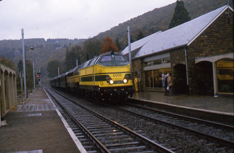 Diesellocomotieven 6006 (reeks 60 proto) en 5211 (reeks 52) staan aan het perron met een reizigerstrein samengesteld uit K 1- rijtuigen. We hebben zicht op de perrons, de verlichting en het stationsgebouw. De elektrificatiewerken van de lijn waren op dat moment bezig, de eerste palen voor de bovenleiding zijn geplaatst. Schenking van Myriam Hendrickx.