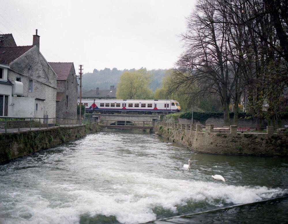 BeschrijvingEen motorstel reeks 03 (Break drieledig) rijdt over een brug in Yvoir. Het stel is geschilderd in de Memling-livrei.