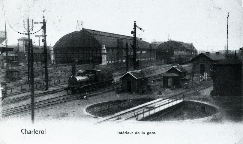 Reproductie van een postkaart met als opschrift 'Charleroi Intérieur de la gare.' De postkaart toont de sporenbundel van het station Charleroi-Zuid. In de voorgrond zien we een draaischijf. Hiermee konden stoomlocomotief gekeerd worden. Er staan enkele dienstgebouwtjes tussen de sporen. We zien ook een stoomlocomotief en enkele mechanische seinen. In de achtergrond zien we de grote sporenhal in staal en glas.