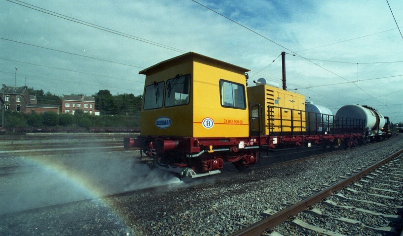 De fotogroep bevat 36 negatieven. De pers krijgt een demonstratie van de nieuwe trein om tijdens de herfst vallende bladeren van de sporen te verwijderen. De trein is samengesteld uit een platte wagen en een ketelwagen van 60.000 liter die gesleept wordt door een rangeerlocomotief, vermoedelijk van het type 91. Op de platte wagen is door de Franse firma Geismar een commandopost, een pompinstallatie en een ketel van 6000 liter water gemonteerd. Er zijn ook enkele detailopnames van de sproeiers die onder hoge druk de sporen reinigen.