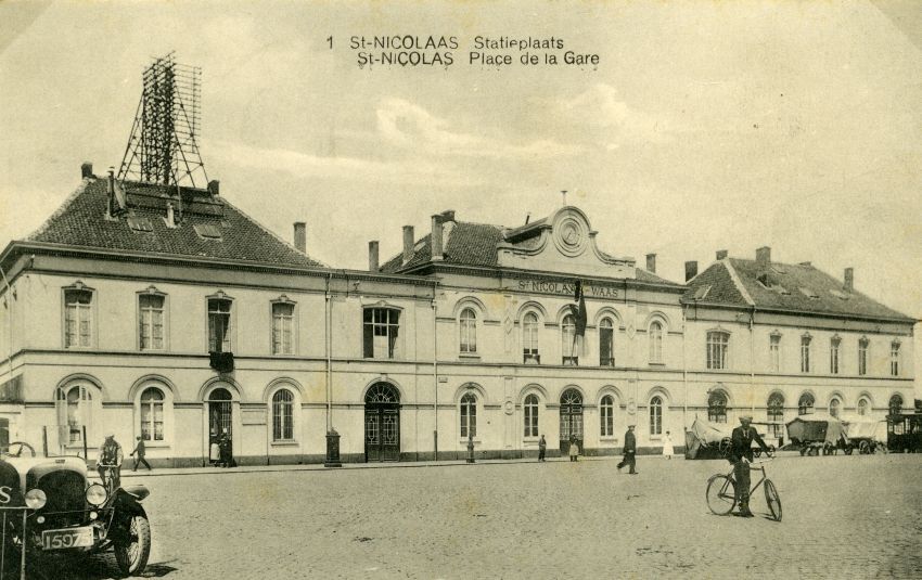 Reproductie van een postkaart met als opschrift 'St-Nicolaas Statieplaats St-Nicolas Place de la Gare'. De postkaart toont de voorgevel van het stationsgebouw. Op de fries onder het centrale fronton lezen we 'St-Nicolaas-Waas'. Op het dak is een telegraafmast geplaatst. Op het stationsplein staan auto's en een bus geparkeerd. Een fietser poseert voor de fotograaf.