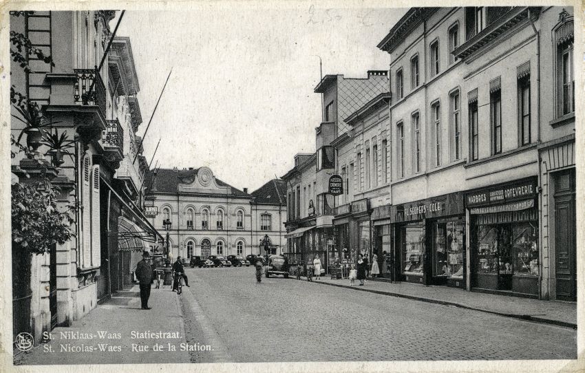 BeschrijvingReproductie van een postkaart met als opschrift 'St. Niklaas-Waas Statiestraat. St. Nicolas Rue de la Station.' De postkaart toont een winkelstraat die uitkomt op het stationsplein. In de achtergrond zien we de voorgevel van het stationsgebouw uit 1845.