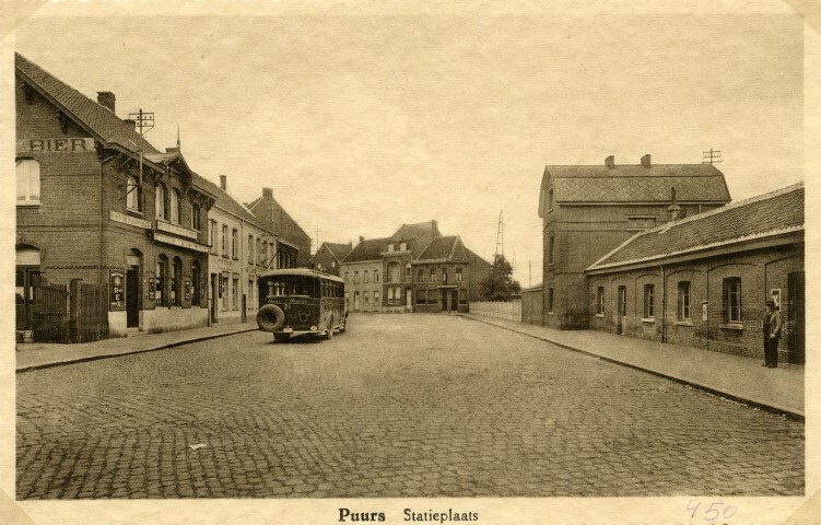 BeschrijvingReproductie van een postkaart met als opschrift 'Puurs Statieplaats'. De postkaart toont de Stationsstraat met rechts het stationsgebouw en links enkele huizen en een café. Een personeelslid poseert voor het stationsgebouw. In de straat rijdt een autobus.