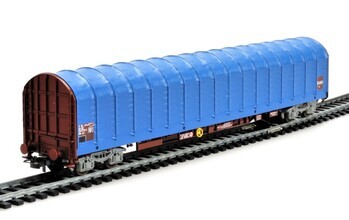 BeschrijvingBruine platte wagen op draaistellen van het type Rils, met blauwe huif. De maquette is op schaal H0 1/87 vervaardigd.