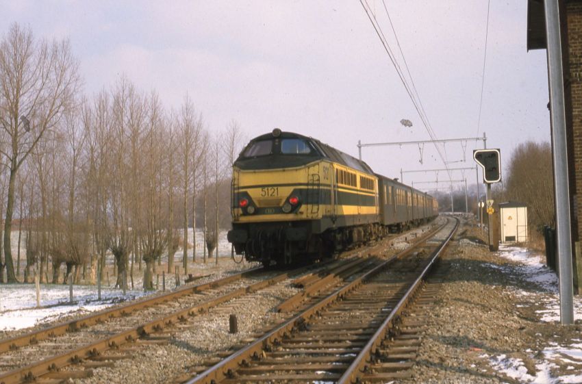 BeschrijvingWe zien de achterzijde van een reizigerstrein met M 2-rijtuigen die wordt geduwd door diesellocomotief 5121. Rechts naast de sporen staat een lichtsein.