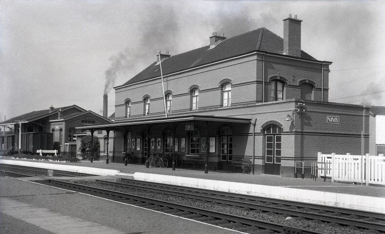 De foto toont het station met luifel en naamborden aan de kant van de sporen. Tegen de achtergevel hangen affiches. Het perron is met zitbanken en elektrische verlichting uitgerust. Om de overzijde van de sporen te bereiken, moeten de reizigers gebruik maken van een gelijkgrondse overgang. Links bevindt zich de goederenloods met overhellend dak. Op een doodlopend spoor staan gesloten goederenwagens opgesteld. Een afsluiting, samengesteld uit betonnen onderdelen, bakent het spoorwegdomein af.