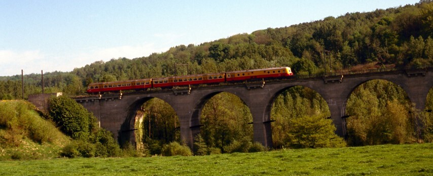 Deze fotogroep bevat acht dia's. Motorwagen 4006 rijdt over het spoorwegviaduct van Remersdaal. Dit viaduct is opgetrokken uit gestampt beton. Met een lengte van 390 meter overspant het de vallei van de Gulp. Het drieledig motorstel is geel en rood geschilderd. Schenking van Myriam Hendrickx.