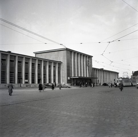 Deze foto toont het nieuwe stationsgebouw van Bergen aan de straatzijde. In de voorgevel van het gebouw is voornamelijk glas gebruikt. Aan de ingang van het station zien we een ruime luifel die de reizigers tegen ongunstige weersomstandigheden beschermd. Aan de rechterzijde is aan de voorzijde een groot uurwerk aangebracht. Vlak voor het station is een tramhalte.