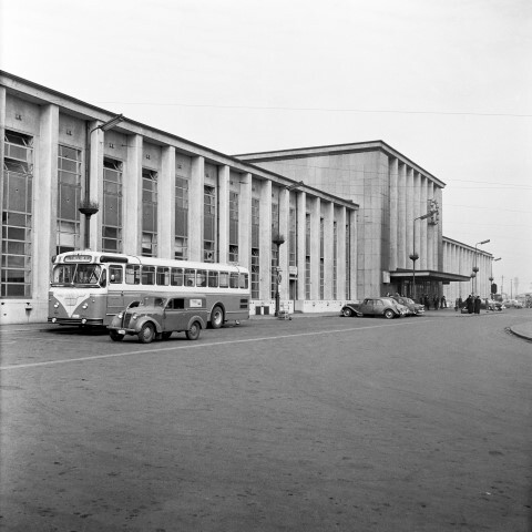 BeschrijvingDe foto toont de voorzijde van het stationsgebouw van Bergen. Voor het station bevindt zich een bushalte. Daarnaast zijn er parkeerplaatsen voor auto's.