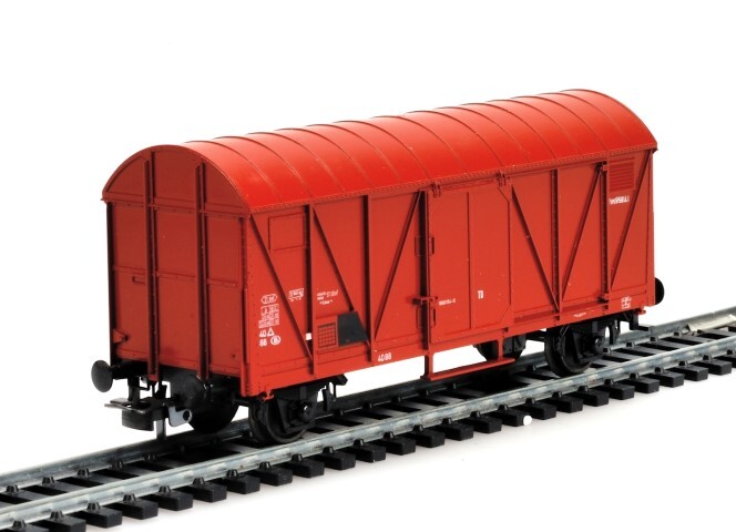 BeschrijvingBruine gesloten wagen van het type Gkklms uit 1947. Deze wagen op twee assen heeft een metalen kast met twee zijdeuren. De maquette is op schaal H0 1/87 vervaardigd.