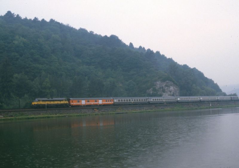 Ce groupe de photos contient deux diapositives. Nous voyons un train de pèlerinage tiré par une locomotive diesel série 54. Le train est composé de voitures françaises, la première voiture derrière la locomotive est un fourgon Dms de la SNCB. Le train roule sur la rive de la Meuse. Don de Myriam Hendrickx.