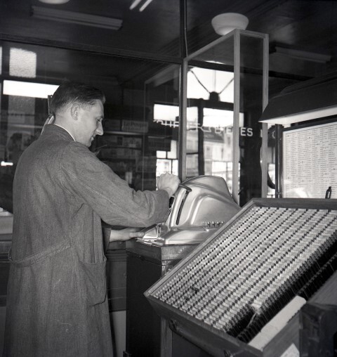 Deze fotogroep bestaat uit drie negatieven. Ze tonen een loketbediende bij het drukken van een spoorkaartje met behulp van een Schustermachine. Eerst neemt hij een cliché met de gewenste bestemming, rijtuigklasse en eventuele reductie uit de bak rechts. Hij steekt het zinken plaatje bovenaan in de kop van het toestel en drukt de bedieningskruk naar beneden. Zo wordt de tekst van het cliché op een kartonnen biljet gedrukt.