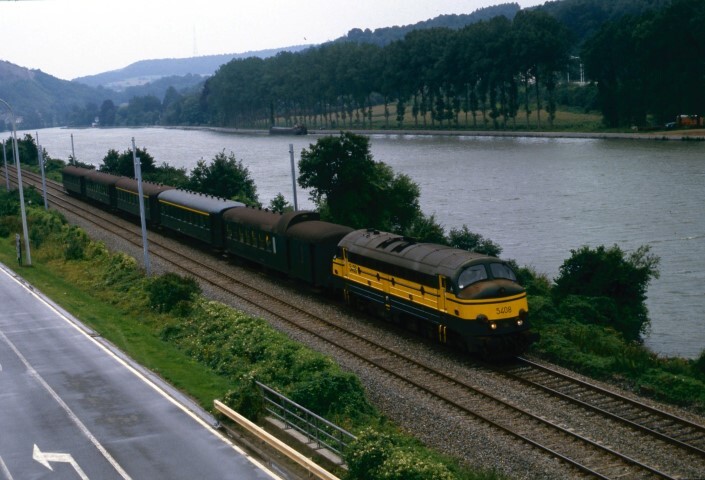 Deze fotogroep bevat twee dia's. Diesellocomotief 5408 (reeks 54) sleept een reizigerstrein die is samengesteld uit K 1-rijtuigen. Op spoorlijn 154 waren op dat moment elektrificatiewerken bezig, langs het spoor zijn de eerste bovenleidingspalen geplaatst. Schenking van Myriam Hendrickx.