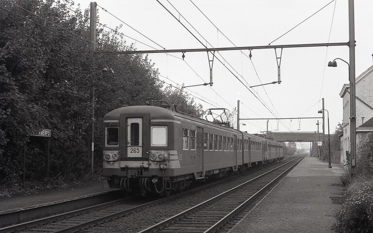 Dit motorstel behoort tot de reeks 00, schijf 1965. Het vormt samen met motorstel 217 een trein. Deze trein bevindt zich aan het perron van het station Erps-Kwerps. Rechts zien we het stationsgebouw met verderop een perronklok. Links en wat verscholen tussen het struikgewas zien we een stationsnaambord. Schenking van Myriam Hendrickx.