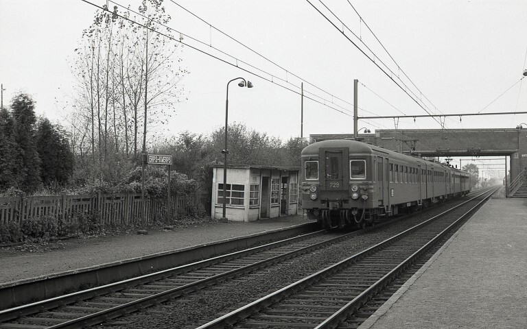 Dit motorstel behoort tot de reeks 06, schijf 1974. Het vormt samen met motorstel 601 een trein. Links zien we een stationsnaambord en een betonnen schuilhuisje met daarachter een typische betonnen spoorwegafsluiting. Beide perrons zijn ongeplaveid. Op de achtergrond bemerken we een wegbrug over de sporen, die tevens dienst doet als perronovergang. Schenking van Myriam Hendrickx.