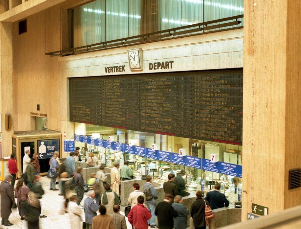 Reizigers staan aan te schuiven aan de zeven loketten in de grote lokettenzaal van Brussel-Centraal. Boven de loketten hangt een grote mechanische treinaankondiger, die het vertrekuur, de bestemming en het ontvangstspoor van alle vertrekkende treinen weergeeft. Daarboven hangt een klok. De felverlichte zaal op de eerste verdieping was vroeger een personeelsrestaurant voor het NMBS-personeel.