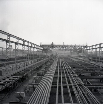 BeschrijvingDeze foto toont de laadinstallatie voor het laden van de lange spoorstaven van 243 meter op werktreinen. Deze installatie bevindt zich in de Centrale Werkplaats Infrastructuur in Schaarbeek (Haren).