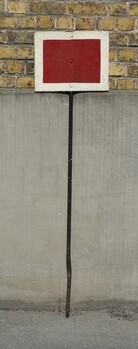 BeschrijvingRechthoekige rode plaat met witte rand. De plaat is gemonteerd op een metalen paal met punt, die in het midden van een spoor in de grond kan gestoken worden. Het seinbord betekent dat het betreffende spoor bezet is.