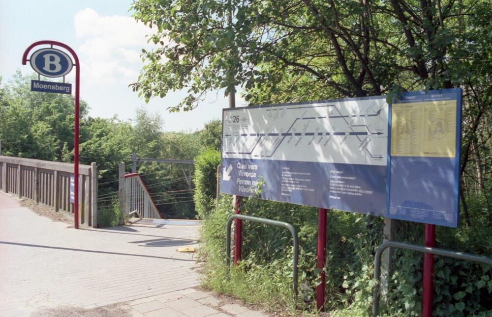 Deze fotogroep bestaat uit drie negatieven. Ze tonen de toegang naar de lager gelegen perrons van stopplaats Moensberg, een spoorweghalte langs spoorlijn 26 (Schaarbeek - Halle) in het zuidwesten van de Brusselse gemeente Ukkel. Het station ligt tussen het centrum van Linkebeek en het oude gehucht Kalevoet. In oktober 2009 werd, in het kader van de werken voor het Gewestelijk ExpresNet (GEN), de halte een honderdtal meter verplaatst naar de kruising met spoorlijn 124 zodat het station aan beide spoorlijnen ligt.