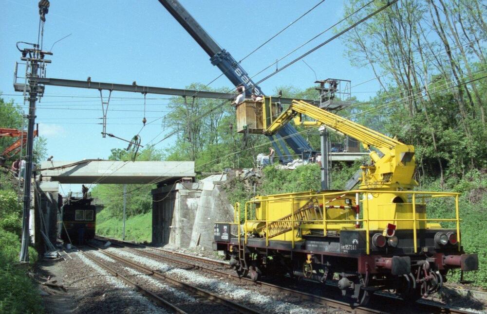 Deze fotogroep bestaat uit vijf negatieven. We zien personeel aan het werk aan de bovenleiding van lijn 26 (Schaarbeek - Halle). Op de foto's A, B en C maken arbeiders gebruik van een hoogtewerker die op een zelfrijdende spoorwagen gemonteerd is. Op foto D staat een arbeider op een werkplatform dat op het dak van motorwagen ES202 gemonteerd is. De motorwagen is groen geschilderd met gele zichtbaarheidsstrepen.