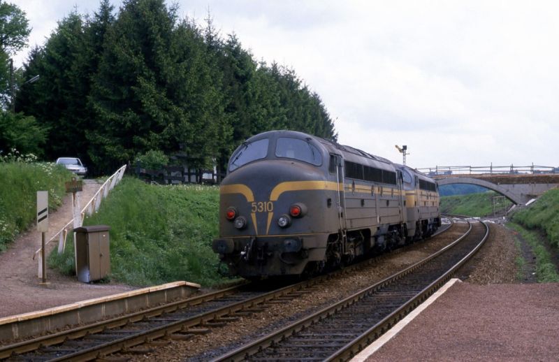 Deze fotogroep bevat twee dia's. Twee diesellocomotieven van de reeks 53 (nummers 5310 en 5301) zijn zonet door het station Lacuisine gereden. We zien de achterzijde van de locomotieven en het uiteinde van de perrons. Links, naast de toegangshelling naar de parking, staat een seinbaken die het mechanisch sein in de achtergrond voorafgaat. Schenking van Myriam Hendrickx.