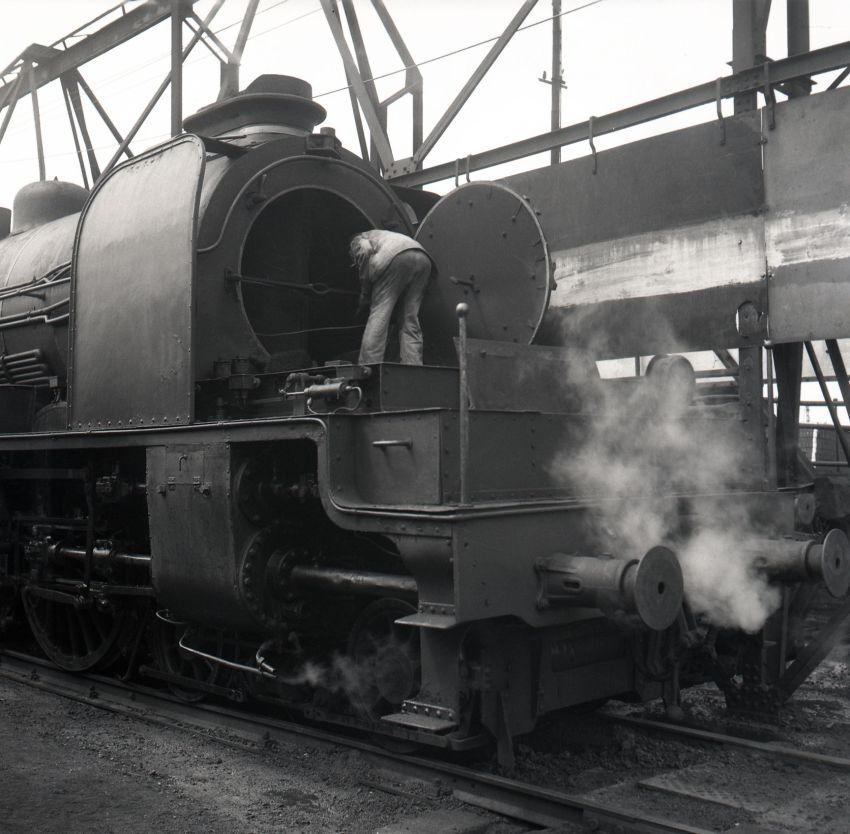 Deze foto toont de reiniging van de rookkast van een stoomlocomotief type 10 (2C1 Pacific). De rookkastdeur staat open en we zien de stoker aan het werk bij het verwijderen van roet en asdeeltjes. Achter de locomotief staat een portaalkraan voor de aanvoer van briketten.