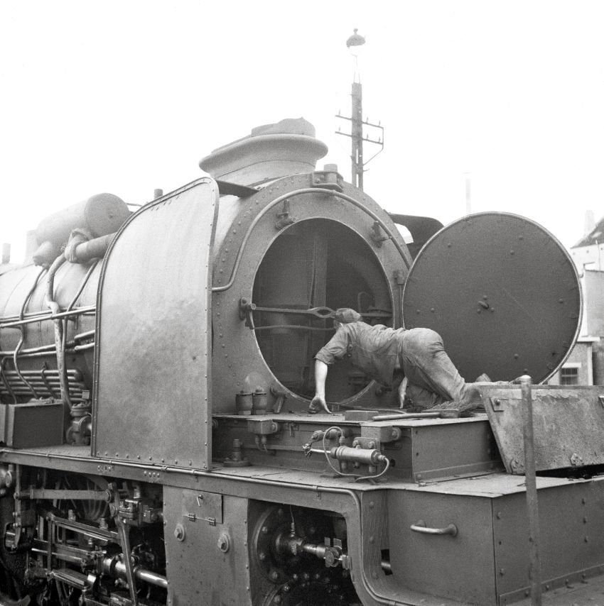 BeschrijvingDeze foto toont een spoorman die bezig is met het onderhoud van de rookkast van een stoomlocomotief type 10 (2C1 Pacific). Om dit nazicht mogelijk te maken is de deur van de rookkast geopend.