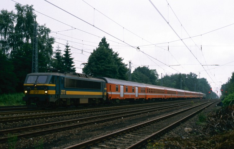Elektrische locomotief 2717 sleept een internationale trein bestaande uit een pakwagen en enkele I 5-rijtuigen. De locomotief is blauw geschilderd met gele zichtbaarheidsstrepen. De rijtuigen hebben een oranje livrei met witte band. Schenking van Myriam Hendrickx.