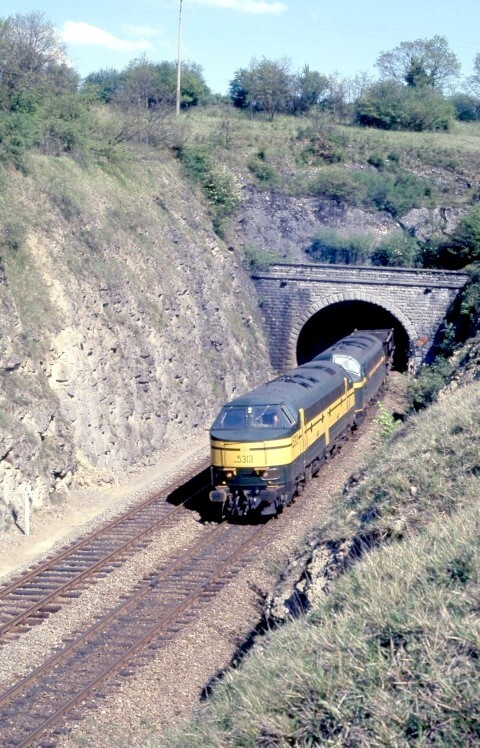 Twee diesellocomotieven reeks 53 (nummers 5313 en 5318) slepen samen een ertstrein. Op de eerste foto verlaat de trein net een tunnel. De tweede dia toont de trein langs de zijkant.