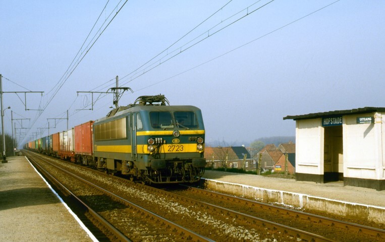 Elektrische locomotief 2723 sleept een containertrein voorbij station Hofstade. Rechts op het perron staat een betonnen schuilhuisje met stationsnaam boven de ingang. Deze stopplaats ligt langs spoorlijn 57 (Dendermonde - Lokeren). Schenking van Myriam Hendrickx.