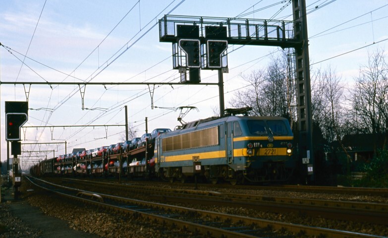 BeschrijvingElektrische locomotief 2721 sleept een goederentrein onder een seinbrug met twee lichtseinen. De eerste drie goederenwagens zijn geladen met auto's.