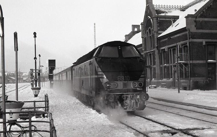 Deze locomotief behoort tot de reeks 62/63. De locomotief is groen geschilderd met gele zichtbaarheidsstrepen. Ze staat met een sleep M 2-rijtuigen aan perron 2 in station Aat. Links zien we een lichtsein van het type III. Op het perron 2/3 staan ronde bloempotten, beschilderd met het stadsschild van Aat. De perrons en sporen zijn ondergesneeuwd. Rechts zien we het stationsgebouw in Vlaamse neorenaissancestijl. Verder zien we op de achtergrond een boogbrug met trekband over de sporen. Schenking van Myriam Hendrickx.