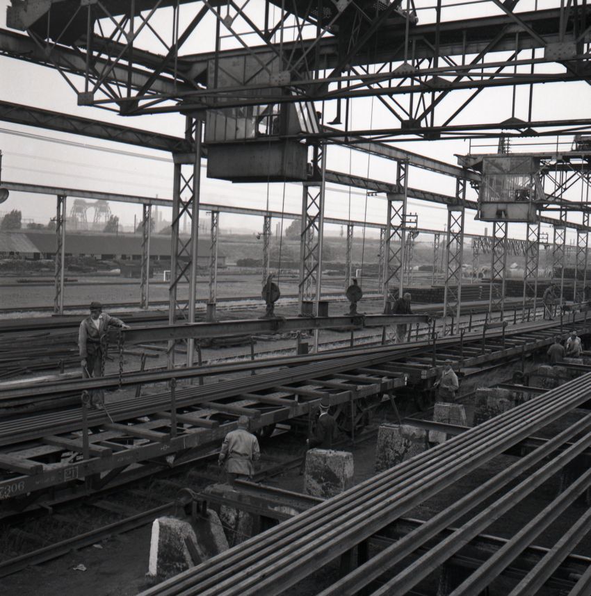 Deze fotogroep bevat zeven negatieven. Ze tonen de installaties voor het laden van lange spoorstaven in de werkplaats infrastructuur te Schaarbeek (Haren). De rails hebben een lengte van 243 meter.
