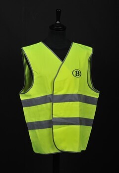 BeschrijvingDit fluo geel vestje heeft twee zilveren reflecterende banden over de buik en rug. Op de linkerborst staat een blauw NMBS-logo. De vest sluit met velcro.