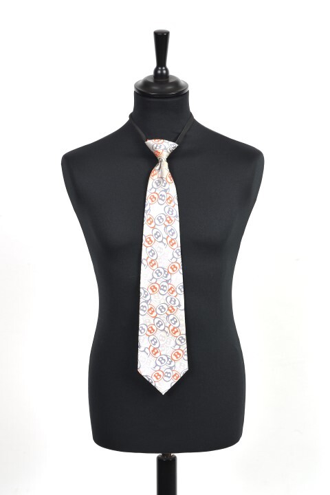 BeschrijvingLichtgrijze das met oranje, blauwgrijze en lichtgrijze logo's van de NMBS. De das wordt met een zwarte rekker rond de hals gesloten.