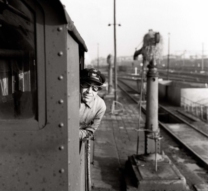 Deze fotogroep bevat twee negatieven. Ze tonen de machinist in het stuurhuis van een stoomlocomotief type 29 (1D Consolidation). Hij staat in een typische houding voor het gadeslaan van de seinen. Aan de rechterzijde zien we de waterkolommen voor het bijvullen van de tender.