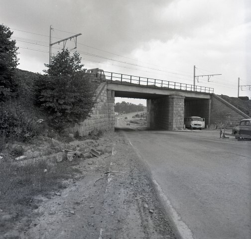 Deze fotogroep bestaat uit vijf negatieven. Ze tonen de aanleg van een nieuwe spoorwegbrug in gewapend beton naast een bestaande met pijlers in natuursteen. Om hogere snelheden mogelijk te maken, is de as van de spoorlijn verlegd. Om de sporen te ondersteunen brengen arbeiders steunbalken aan. De foto's werden vermoedelijk gemaakt in Assesse.