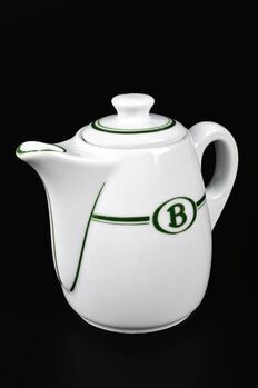 BeschrijvingWitte kan met een dubbele groene bies en het logo van de NMBS. De kan heeft een dekseltje met twee groene biezen. Ook het oor en de tuit zijn versierd met groene biesjes.